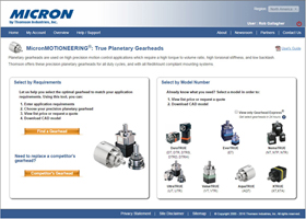 2016.03.16 - Wolfschlugen, Germany – Thomson Industries, Inc., a leading manufacturer of mechanical motion control solutions, has expanded its web-based sizing and selection tool for Micron® TRUE Planetary? Gearheads. The web-based MicronMOTIONEERING® is a unique, application-based sizing and selection tool that quickly and easily identifies the correct planetary gearhead for your application. The improved MicronMOTIONEERING® interface and expanded product offering, allows users to save time and boost confidence in knowing that they’ve selected the optimal gearhead for their motion control application.