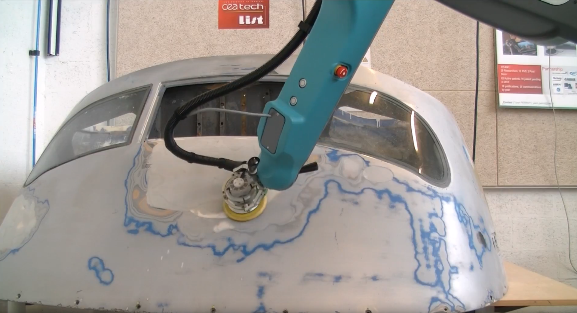 Figure 1: Yvan M. Measson, CEO of ISYBOT, demonstrates how a Cobot can help sand the hull of an aircraft cabin.